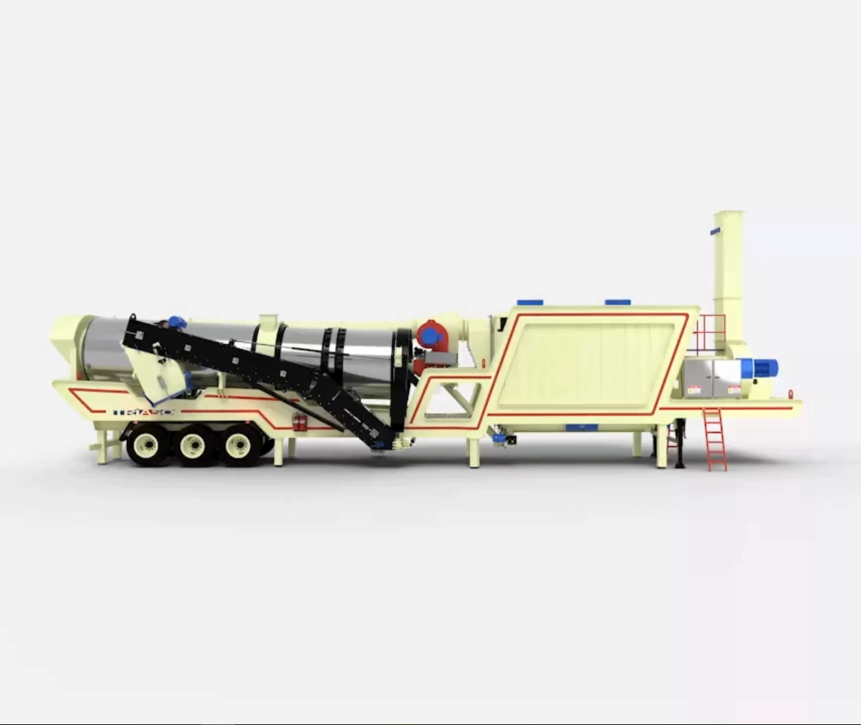 The vertical drag slat features a retractable configuration that complies with DOT transportation height limits, ensuring safe and legal road transport. Once the drum mixer is installed on-site, the elevator extends to its full operational height, allowing efficient material discharge into trucks with minimal setup time. This smart design improves logistics while maintaining high performance during loading and discharge operations.