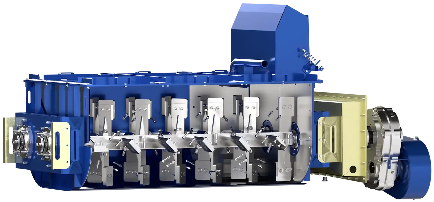The pugmill features twin synchronized shafts driven by a gear system for balanced and efficient mixing. Its cast-iron mixer paddles are fully interchangeable and built for durability. During operation, a protective internal layer forms naturally, reducing direct wear on the structure and extending the equipment’s service life.