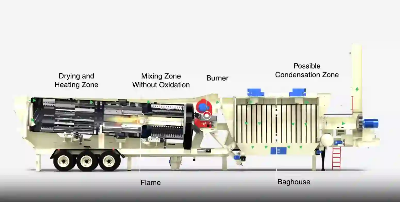 This drum rotation system is controlled by a Variable-Speed Rotation Drive, which allows precise control of RAP residence time inside the drum. The heating exposure time directly affects RAP binder softening and its ability to fully blend and incorporate with virgin aggregates. This exposure time must be adjusted according to the RAP percentage in the mix.